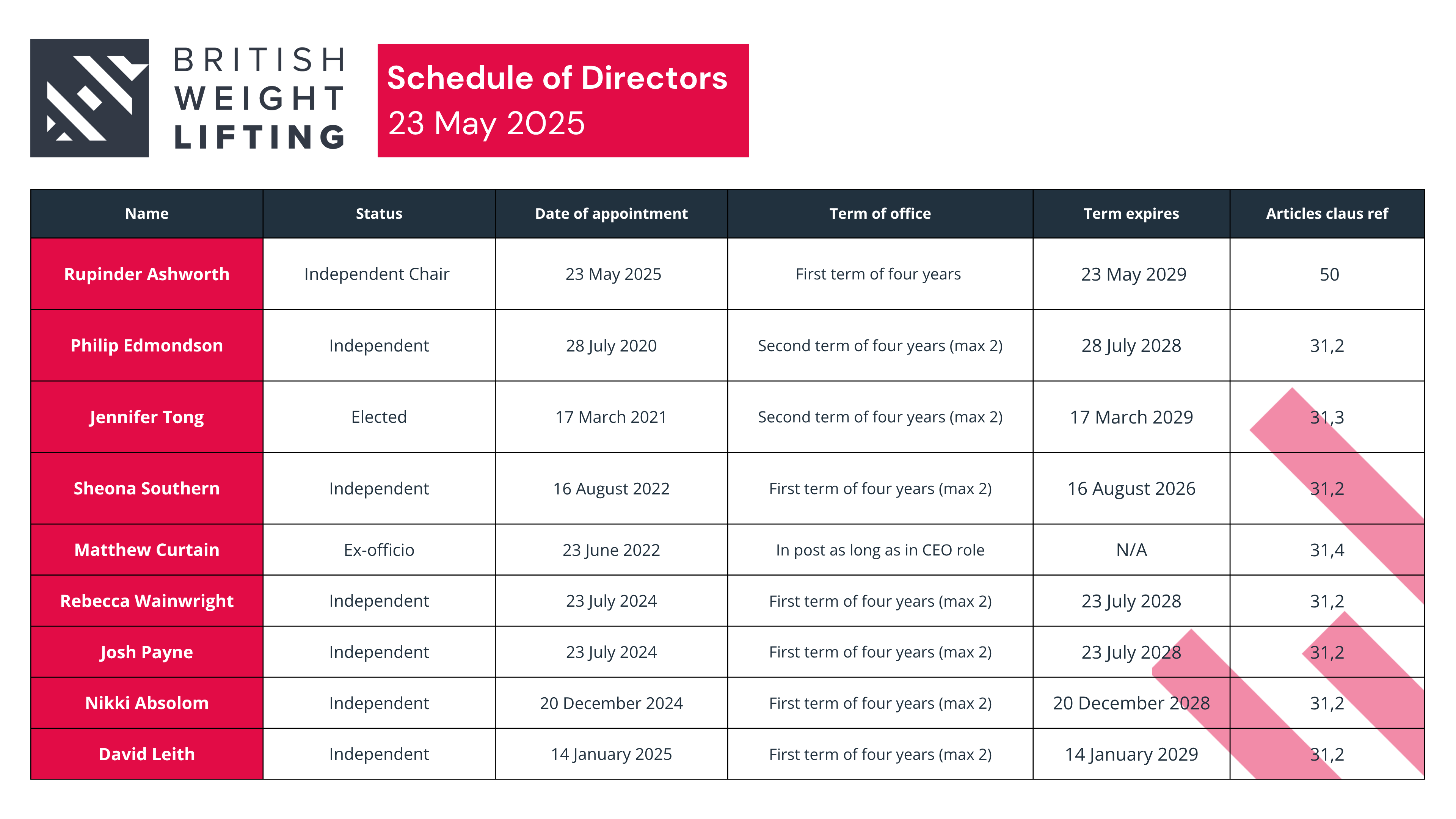 To contact a member of the Board, please email tara.drake@britishweightlifting.org