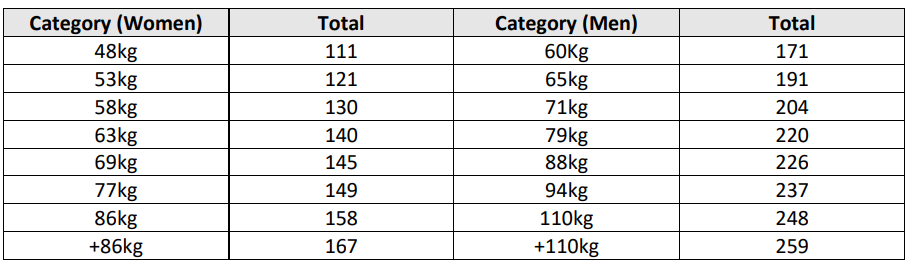 - 5 October 2024 to 13 April 2025 - Results attained in the ‘old’ bodyweight categories (including exact bodyweight) will be sorted into the ‘new’ bodyweight categories. For example, if a 49kg women has weighed 48kg or less, this result will automatically be ranked in the new 48kg bodyweight category.